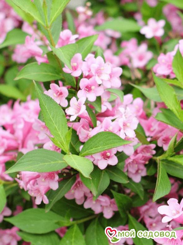 Вейгела Розеа (Weigela florida Rosea) —  гибрид между вейгелой цветущей и вейгелой корейской. Раскидистый кустарник до 2м высотой и до 2,5м шириной. Цветки очень крупные  с колосовидным отгибом, розовые, слегка пестрят белым, обильно появляются на кусте в июне месяце. Листья светло-зеленого цвета, осенью краснеют. Этот сорт зимует лучше всех других, ему требуется лишь небольшое укрытие листом.  Любит солнечные места, плодородные дренированные почвы.   Уход за растением:  Саженцы вейгелы нужно сажать в плодородную, воздухопроницаемую почву. Сразу учитывайте, что место постоянное, так как пересадить массивный куст с пышной кроной даже при желании будет практически невозможно. Для того, чтобы растение выглядело аккуратно, его нужно стричь, удаляя больные и поврежденные ветки и формируя крону так, как вам это нужно. В первый сезон кустарник нуждается в регулярном поливе, затем вейгелу поливают только при длительных засухах.